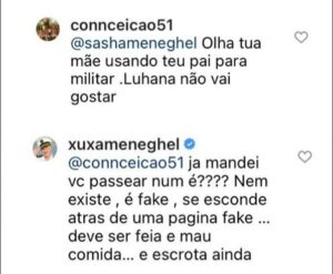 “Já mandei você passear, não é? Nem existe, é fake, se esconde atrás de uma página fake. Deve ser feia e mal comida. E escrota ainda”, respondeu Xuxa.