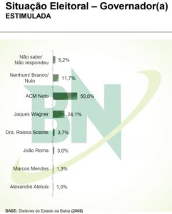 O primeiro cenário testado inclui os nomes de ACM Neto, Jaques Wagner, Dra. Raíssa Soares (sem partido), João Roma (Republicanos), Marcos Mendes (PSOL) e Alexandre Aleluia (DEM). Com essa configuração, o ex-gestor soteropolitano obtém 50% das intenções de voto, enquanto Wagner fica com 24,1%. Conhecida como Doutora Cloroquina, a secretária de Saúde de Porto Seguro seria opção para 3,7% e o ministro da Cidadania teria 3% das intenções de voto. O ex-vereador de Salvador pelo PSOL ficaria com 1,3%, enquanto o herdeiro de José Carlos Aleluia teria 1%. Não souberam ou não responderam 5,2%, enquanto 11,7% disseram que não votariam em qualquer um dos candidatos ou optaria por voto em branco ou nulo.