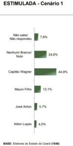 O deputado federal Capitão Wagner (PROS-CE) lidera as intenções de voto para a eleição para o governo do Ceará, em 2022, em cenário estimulado em pesquisa do Instituto Paraná Pesquisas. Ele foi a opção escolhida por 44,9%% dos eleitores. Mauro Filho aparece em segundo lugar com 13,1%