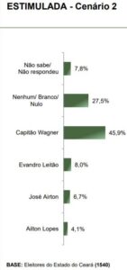 Outro cenário sem o nome de Mauro Filho e com a inclusão de Evandro Leitão foi apresentado. Neste caso, Capitão Wagner aparece com 45,9% e lidera. Seguido por Evandro Leitão com 8%; José Airton com 6,7%% e Ailton Lopes com 4,1%. O número dos que não sabem ou não responderam foi de 7,8% e 27,5% responderam que votariam branco/nulo.