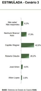 Em seguida aparecem José Airton com 5,7% e Ailton Lopes com 4%. Os eleitores que não souberam ou não responderam representam 7,6%%. Já os que votariam branco ou nulo somam 24,8%.