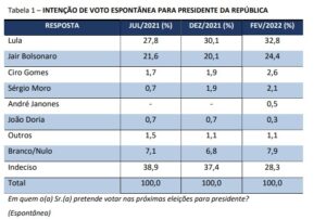 De acordo com o levantamento, o ex-capitão saiu de 25,6% em dezembro de 2021 para 28% em fevereiro deste ano. Em julho do ano passado, o presidente aparecia com 26,6%.