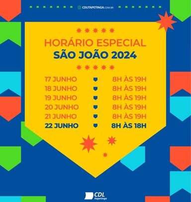 A Câmara de Dirigentes Lojistas (CDL) de Itapetinga, e o Sindicato dos Empregados do Comércio de Itapetinga e Itororó, anunciam que, em conformidade com a Convenção Trabalhista, firmou-se um acordo para o funcionamento do comércio em horário especial durante os festejos juninos de 2024.