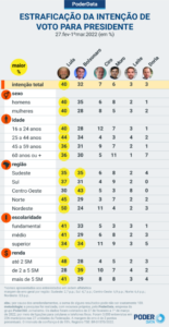 1º de março de 2022. A margem de erro é de 2 pontos percentuais. O intervalo de confiança é de 95%. O registro no TSE é BR 01570/2022. O PoderData também testou os nomes de Lula e Jair Bolsonaro em um confronto direto de 2º turno. Leia aqui. ESTRATIFICAÇÃO Lula tem os seus maiores percentuais na região Nordeste (50%) e entre eleitores com renda familiar de até 2 salários mínimos (48%). Bolsonaro empata com o petista na região Sudeste (os 2 têm 35%) e lidera no Centro-Oeste com 43%. Bolsonaro também desempenho superior entre o eleitorado evangélico.