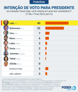 O ex-presidente Luiz Inácio Lula da Silva (PT) tem 40% das intenções de voto em 1º turno para a Presidência da República contra 32% do atual ocupante da cadeira, Jair Bolsonaro (PL). O dado foi revelado por pesquisa PoderData realizada de 27 de fevereiro a 1º de março de 2022