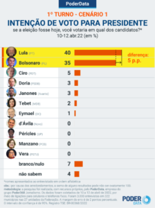 Pesquisa PoderData realizada de 10 a 12 de abril de 2022 mostra que o ex-presidente Luiz Inácio Lula da Silva (PT) tem 40% das intenções de voto para as eleições presidenciais de 2022, seguido pelo presidente Jair Bolsonaro (PL), com 35%