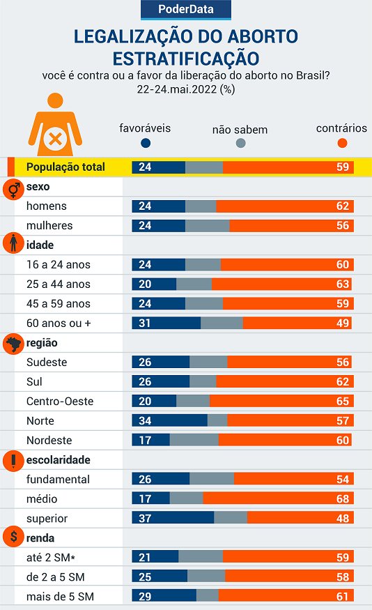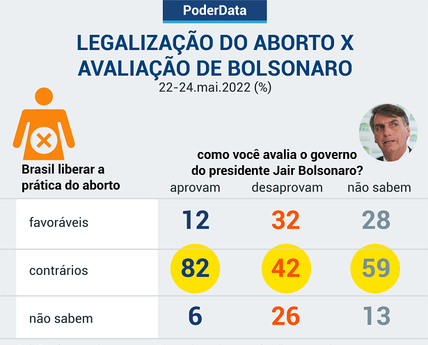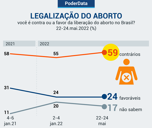 Pesquisa PoderData realizada de 22 a 24 de maio de 2022 mostra que 59% da população brasileira são contra uma possível descriminalização do aborto no país. A taxa teve oscilação de 4 pontos percentuais para cima, no limite da margem de erro, desde o último levantamento, de janeiro.