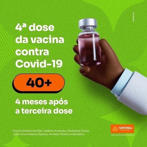 A Prefeitura de Itapetinga, através da Secretária de Saúde, informa ao público que já está disponível, em seus postos de saúde, a quarta dose (de reforço) da vacina de combate à Covid-19 para as pessoas com 40 anos e acima dessa idade.