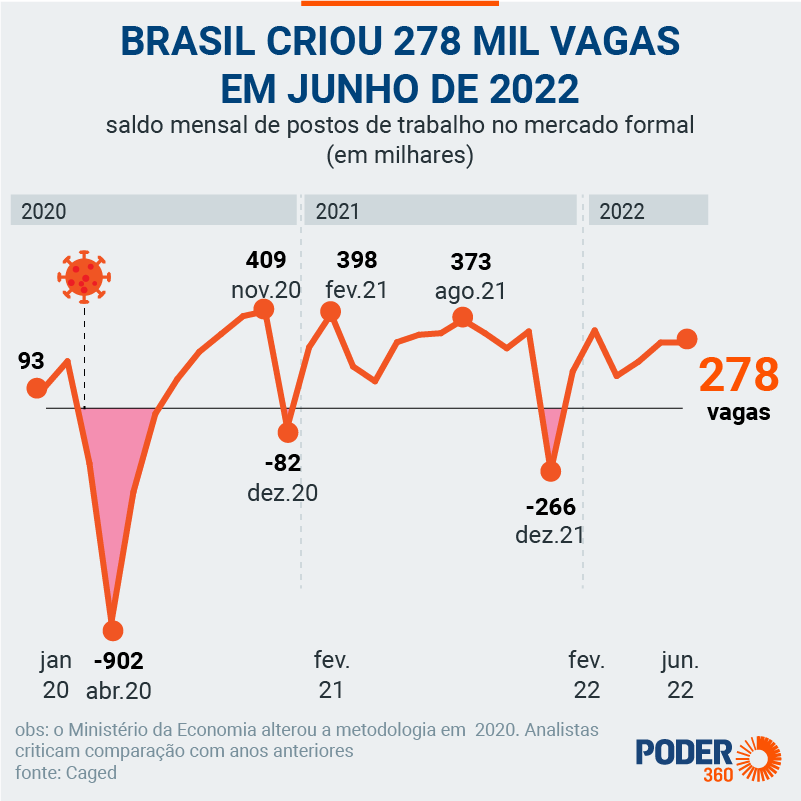 País tem 6º mês seguido de alta, com 278 mil vagas abertas em junho, segundo o Ministério do Trabalho. Fonte: Poder 360
