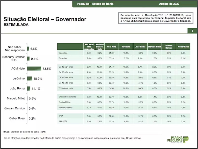 O Paraná Pesquisas realizou 1.640 entrevistas pessoais em 70 municípios baianos, entre os dias 11 e 15 de agosto, e a pesquisa foi registrada sob nº BA-05896/2022.