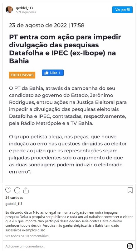 “Eu discordo disso. Não acho legal nem uma coligação nem outra impugnar pesquisa”, escreveu Geddel ao compartilhar matéria deste Política Livre sobre a ação movida pelos petistas contra as sondagens.