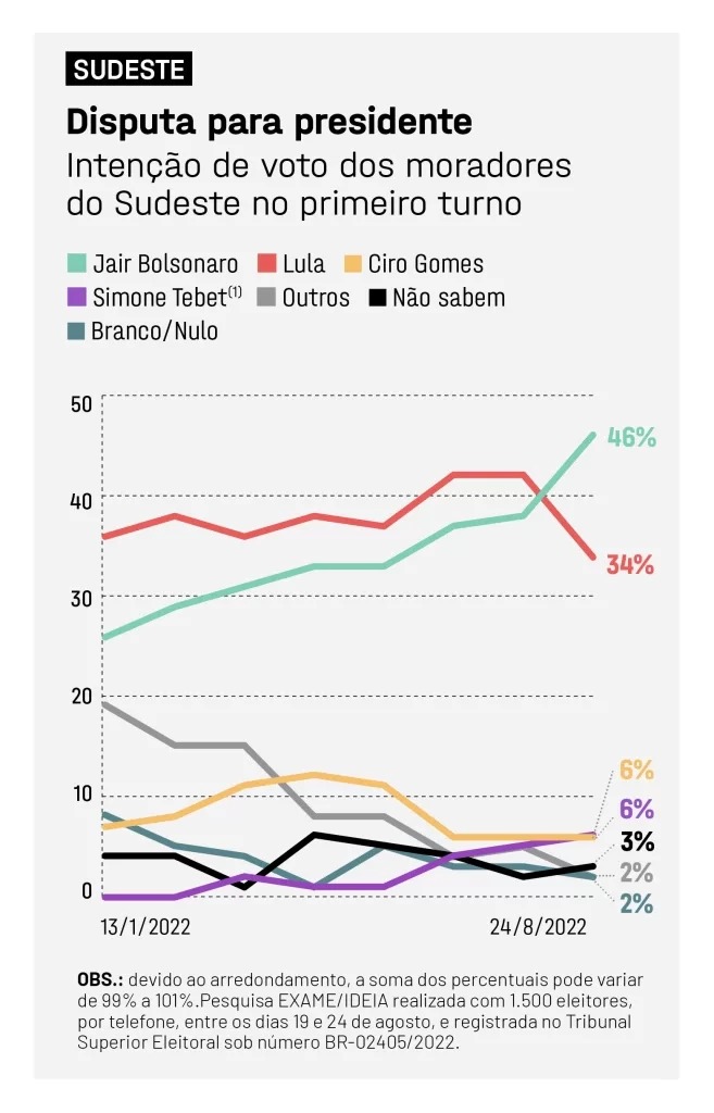 De acordo com a sondagem, Bolsonaro tem 46% das intenções de voto, contra 34% do petista, entre os moradores do Sudeste. É a primeira vez em mais de um ano que o candidato à reeleição ultrapassa Lula. A distância entre os dois se mantinha estável, sempre dentro do limite da margem de erro da pesquisa, que é de três pontos percentuais para mais ou para menos. Em relação à sondagem de julho, o atual presidente cresceu oito pontos percentuais.