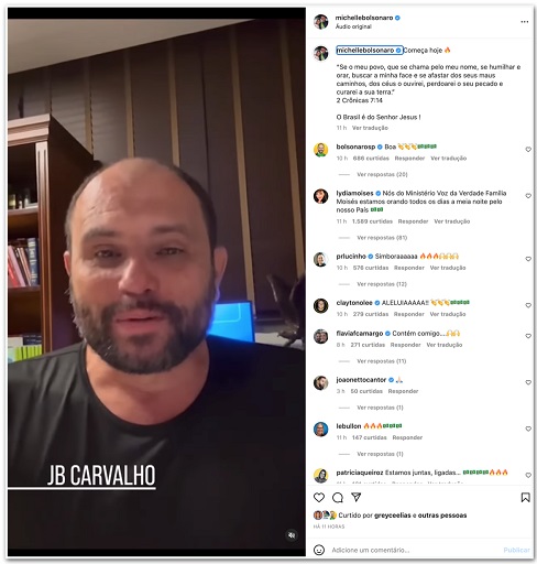 Michelle compartilhou em seu perfil no Instagram, no domingo (31/07), vídeos em que aparece cantando e pregando com uma Bíblia na mão. Ela também realizou uma vigília em frente ao Alvorada.