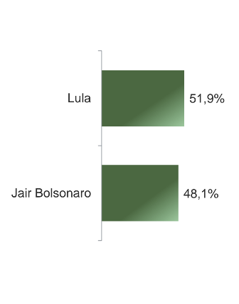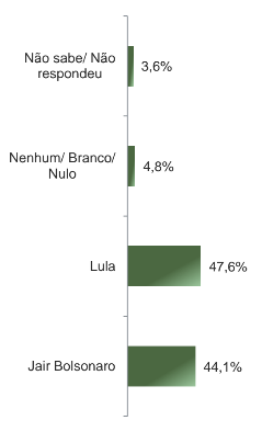 Já no cenário contabilizando os votos totais, os dois candidatos aparecem em empate técnico. Lula aparece com 47,6% contra 44,1%. Nesta simulação, 3,6% dos entrevistados não souberam ou não responderam e 4,8% declararam voto em nenhum candidato, branco ou nulo.