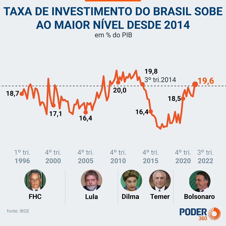 A taxa de investimento do Brasil foi de 19,6% do PIB no 3º trimestre de 2022. Esse é o maior nível desde 2014. O IBGE (Instituto Brasileiro de Geografia e Estatística) divulgou o resultado na 5ª feira (1º.dez.2022). Eis a íntegra do relatório (2 MB).