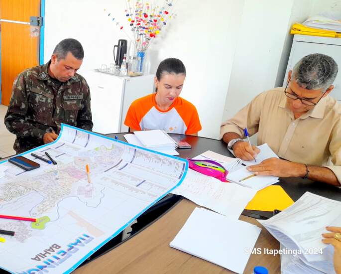 Após o 1º Dia de Mobilização de Combate à Dengue realizado no bairro Nova Itapetinga, as equipes das Secretarias de Saúde, Transportes, Meio Ambiente, Infraestrutura, Núcleo Regional de Saúde do Sudoeste, Base Regional de Saúde de Itapetinga, Grupamento de Bombeiros do 7º GBM e Tiro de Guerra 06-023, se reuniram no gabinete da secretária Rosânia Rabelo, no final da tarde de terça-feira, 09/04, para avaliação do trabalho executado e alinhamento das ações que serão realizadas nesta quarta-feira, 10/04, no restante do bairro Nova Itapetinga e no bairro Clodoaldo Costa.