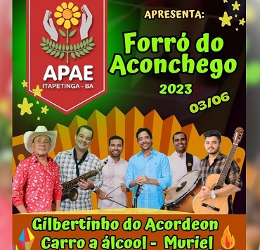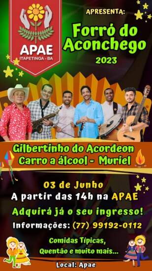 Acontecerá no próximo sábado, 03/06, o Forró do Aconchego 2023, realizado pela APAE–Associação de Pais e Amigos dos Excepcionais de Itapetinga em sua sede.