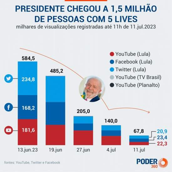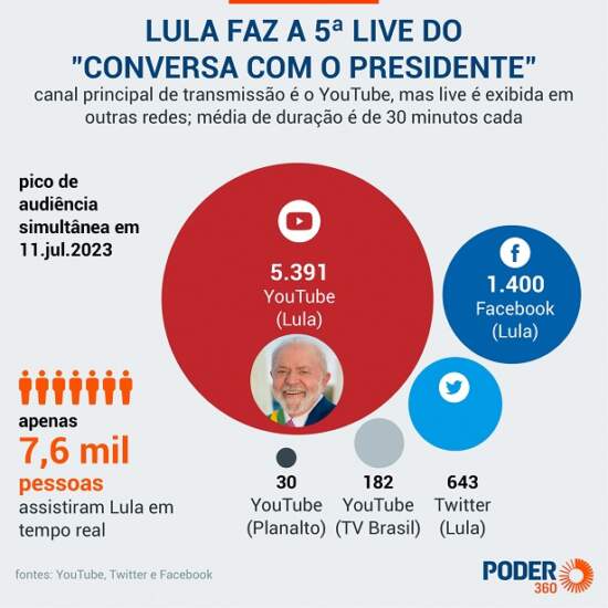 O presidente Luiz Inácio Lula da Silva (PT) realizou sua 5ª live semanal. Chamada de “Conversa com o presidente”, as 5 edições do programa acumulavam 1.476.394 visualizações nas redes sociais oficiais do chefe do Executivo e do governo até às 11h desta 3ª feira 3ª feira (11.jul.2023).
