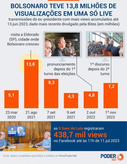 As lives mais assistidas de Bolsonaro acumulam milhões de visualizações. A mais visualizada (assista aqui), transmitida em agosto de 2021, teve 13,8 milhões de espectadores (apenas no Facebook) até 13 de junho, dado mais recente divulgado pela Bites. Até às 11h desta 3ª feira (11.jul), as 5 edições do “Conversa com o presidente”, somadas, registravam apenas 438,7 mil visualizações no Facebook.