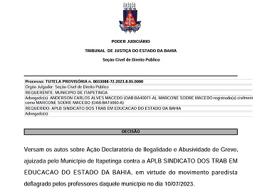 ITAPETINGA: CONFIRA A DECISÃO JUDICIAL QUE CONSIDEROU ILEGAL A GREVE DE PROFESSORES MUNICIPAIS