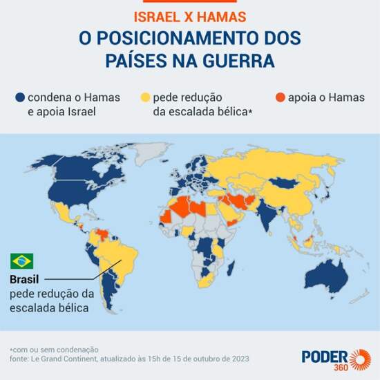 Ao menos 62 países declararam apoio a Israel desde o início do conflito armado contra o Hamas. O levantamento é do jornal francês Le Grand Continent com dados atualizados até 15h de domingo (15.out.2023).