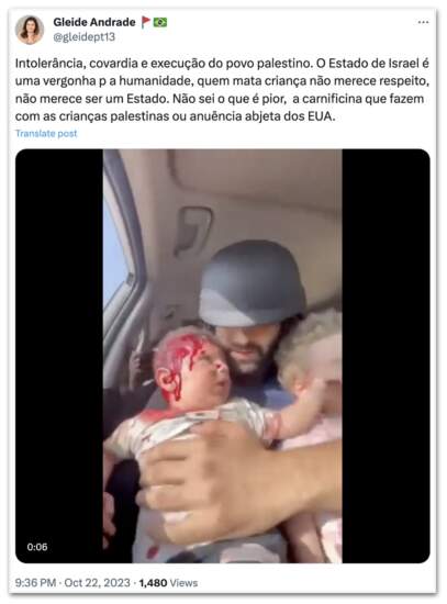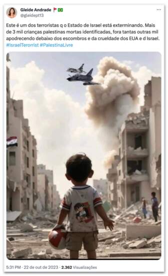 “Não sei o que é pior, a carnificina que fazem com as crianças palestinas ou anuência abjeta dos EUA”, escreveu. Em outro tweet, Andrade compartilhou a foto de uma criança e disse que era “um dos terroristas que o Estado de Israel” está “exterminando”.