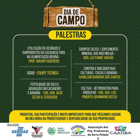 A ser realizada na Região Serra Pelada II, na BA-646, em Caatiba, município do Médio Sudoeste Baiano, a palestra DIA DE CAMPO envolverá a Cacaicultura, manejo sustentável na integração da lavoura, pecuária de leite e corte.