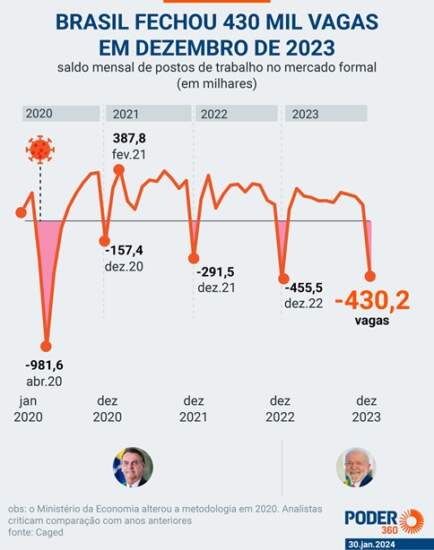 O Brasil criou 1.483.598 empregos formais em 2023, divulgou nesta 3ª feira (30.jan.2024) o Ministério do Trabalho e Emprego. Houve uma queda de 26,3% em comparação com 2022, quando o país registrou 2.013.261 novas vagas com carteira de trabalho assinada. Os dados são do Caged (Cadastro Geral de Empregados e Desempregados).