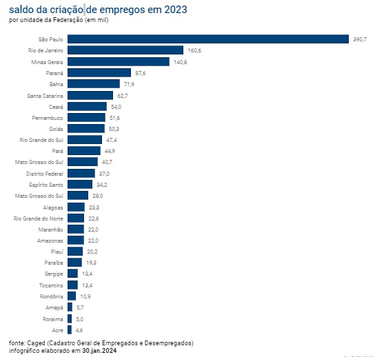 Os dados mostram ainda que São Paulo foi o Estado com a maior criação de vagas em 2023. Leia abaixo: