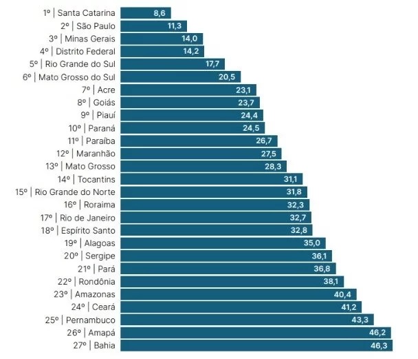 Por outro lado, Santa Catarina foi considerada o mais seguro entre os estados no país, com apenas 8,6 assassinatos a cada 100 mil habitantes no ano anterior. Na sequência aparece São Paulo, Minas Gerais, Distrito Federal, Rio Grande do Sul, Mato Grosso do Sul, Acre, Goiás, Piauí e Paraná, que completam o top 10 de regiões mais seguras.