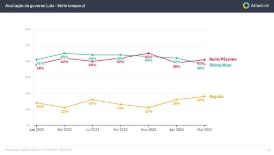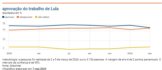 Pesquisa da AtlasIntel divulgada nesta 5ª feira (7.mar.2024) mostra que a opinião dos brasileiros sobre o desempenho do presidente Luiz Inácio Lula da Silva (PT) está dividida: 47% dizem aprovar seu trabalho, enquanto 46% declaram desaprovar. Os percentuais empatam dentro da margem de erro do levantamento, de 2 pontos percentuais.