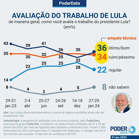 Pesquisa PoderData realizada por este jornal digital de 27 a 29 de janeiro de 2024 mostrou que a avaliação do desempenho de Lula no início do 2º ano do 3º mandato do petista está empatada, na margem de erro da pesquisa, de 2 pontos percentuais.