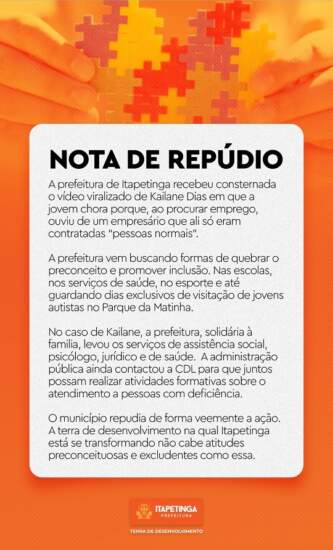 O município repudia de forma veemente a ação. Precisamos, juntos, construir uma sociedade melhor e mais inclusiva, através do diálogo, dos serviços públicos e da conscientização de todos. A terra de desenvolvimento na qual Itapetinga está se transformando não cabe atitudes preconceituosas e excludentes como essa.