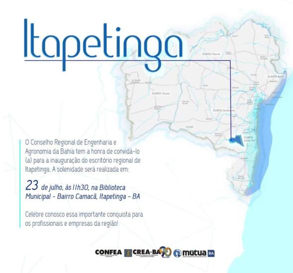 O Conselho Regional de Engenharia e Agronomia da Bahia (Crea-BA) vai inaugurar um novo escritório regional na Bahia. Dessa vez, quem receberá a nova instalação são os profissionais e moradores de Itapetinga, na Região Centro-Sul. A solenidade será realizada no dia 23 de julho, às 11h30, na Rua Ilhéus, nº 223/229, bairro Camacã.