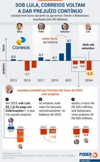 Os Correios enfrentam problemas financeiros e devem ter o seu maior deficit da história em 2024. Até setembro, foram R$ 2 bilhões. Se continuar nesse ritmo, pode superar o deficit de 2015, de R$ 2,1 bilhões, registrados quando Dilma Rousseff (PT) era a titular do Palácio do Planalto.