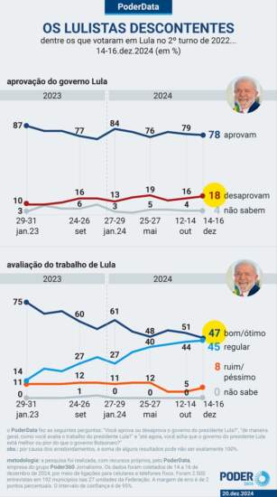 O presidente Luiz Inácio Lula da Silva (FT) está próximo da encerrar o 2º ano à frente do Planalto e chegar à metade de seu 3º mandato. Pesquisa Poder Data realizada do 14 a 16 de dezembro mostra que 18% dos eleitores que dizem ter votado no presidente no 2° turno das eleições de 2022 agora rejeitam a administração do petista. Desde o início do governo, essa taxa subiu & pontos percentuais.