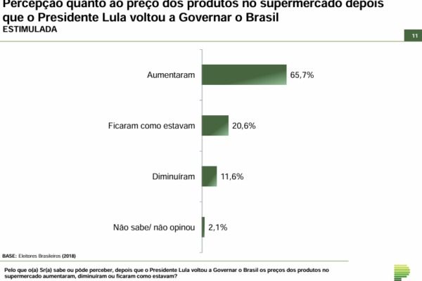 Pesquisa divulgada pelo Instituto Paraná Pesquisas revela que 65,7% dos brasileiros perceberam um aumento nos preços dos supermercados desde que o presidente Lula voltou ao poder. Apenas 11,6% acreditam que os preços diminuíram, enquanto 20,6% afirmaram que permaneceram iguais.