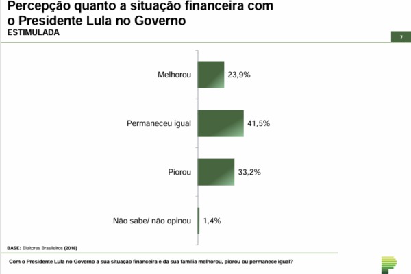 A pesquisa também revela a percepção da população sobre a sua situação financeira sob o governo de Lula. Segundo os dados, 33,2% afirmam que sua situação piorou, 41,5% alegam que permaneceu a mesma, e apenas 23,9% indicam uma melhora.