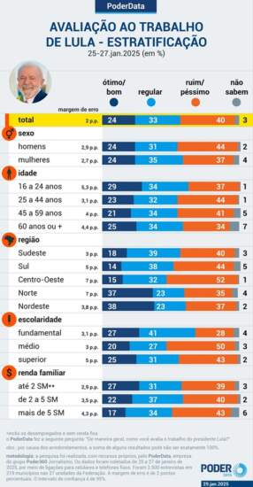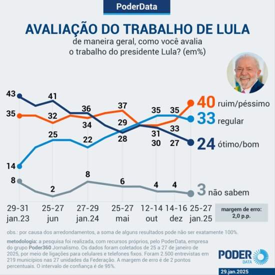 O trabalho pessoal de Luiz Inácio Lula da Silva (PT) como presidente é considerado “bom” ou “ótimo” por 24% dos eleitores. Quando retornou ao Planalto pela 3ª vez, Lula era bem avaliado por 43%. A taxa caiu 19 pontos percentuais e está no menor patamar desde a posse do petista, em janeiro de 2023. Os dados são de pesquisa PoderData realizada de 25 a 27 de janeiro de 2025.