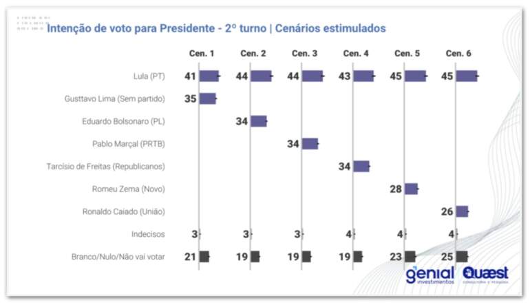 O levantamento Genial/Quaest mostra que Lula venceria todos os possíveis adversários em um eventual 2º turno. O pior desempenho seria contra Gusttavo Lima. Neste cenário, Lula teria 41% e Gusttavo Lima, 35%.