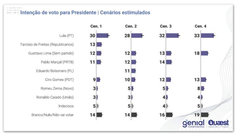A pesquisa entrevistou 4.500 pessoas de forma presencial de 23 a 26 de janeiro. A margem de erro é de 1 ponto percentual, para mais ou para menos. O nível de confiança é de 95%. O levantamento foi encomendado pela Genial Investimentos. Eis o cenário completo: