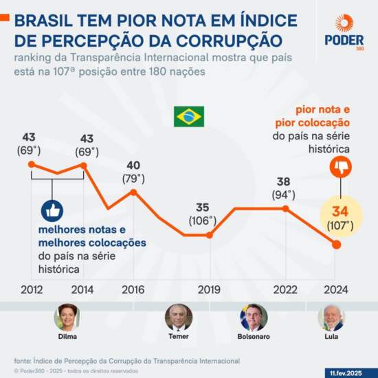O Brasil atingiu em 2024 a sua pior colocação no Índice de Percepção da Corrupção divulgado nesta 3ª feira (11.fev.2025) pela Transparência Internacional. De acordo com a ONG, o país está na 107ª posição em um ranking com 180 nações.