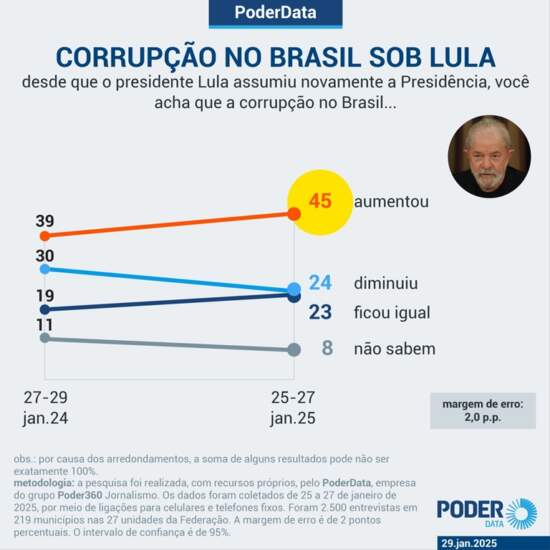 Pesquisa PoderData realizada de 25 a 27 de janeiro de 2025 também apontou o aumento da percepção dos brasileiros sobre a corrupção no país. O levantamento mostrou que 45% dos entrevistados avaliam que há mais casos de corrupção no Brasil em relação a janeiro de 2024. A taxa subiu 6 pontos percentuais em 1 ano. O grupo dos que dizem que a corrupção diminuiu era de 30% há 1 ano. Caiu para 24%. Outros 23% afirmaram que “ficou igual” e 8% não souberam responder.