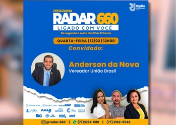 O vereador Anderson da Nova (União Brasil) foi o entrevistado desta quarta-feira, 12, no Programa Radar 660 da Rádio Jornal AM de Itapetinga, pelo trio de comunicadores (Joilson Filho, Portelinha e Lia Barreto), que conduzem o Radar com muita agilidade, dinamismo e muita experiência.