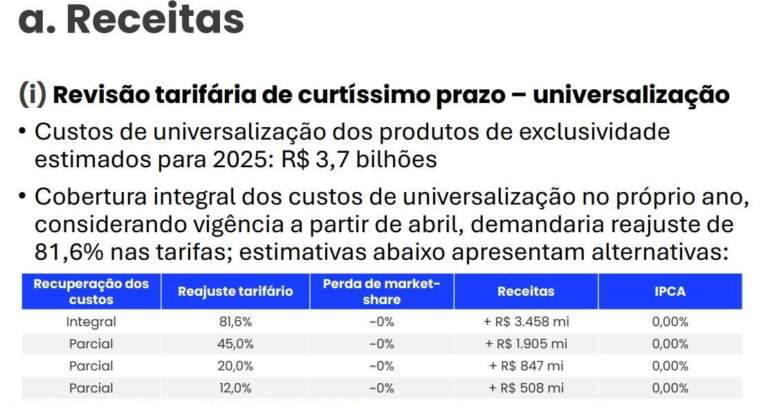 A estatal traçou cenários de 12%, 20%, 45% e 81,6%. Neste último caso, o estudo prevê R$3,4 bilhões em caixa… até ficar insolvente outra vez.