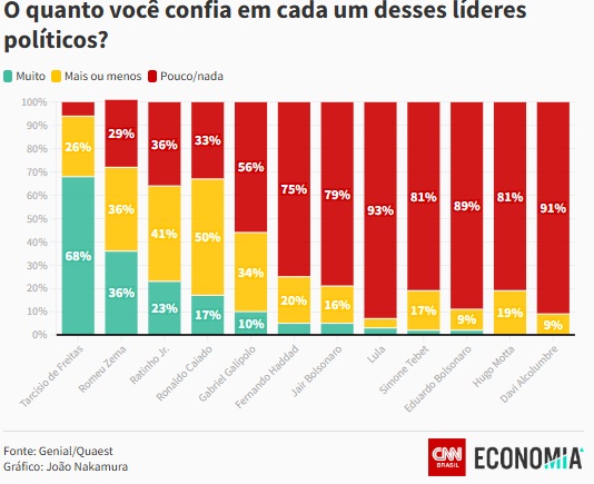 São 19% os que confiam mais ou menos em Motta, enquanto 81% confiam pouco ou nada. Enquanto isso, 9% responderam mais ou menos sobre Alcolumbre; e 91%, pouco ou nada.