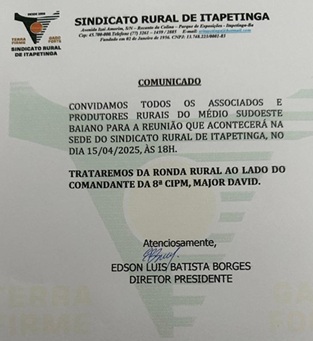O Sindicato Rural De Itapetinga, por meio de seu diretor presidente Edson Luis Batista Borges, convida todos os associados e produtores rurais do Médio Sudoeste Baiano para reunião que acontecerá em sua sede, hoje (15/04) 18h.