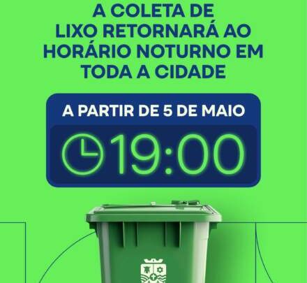 No entanto, atendendo à solicitação da população, já acostumada com o horário antigo de coleta, a prefeitura retorna à programação habitual, recolhendo todo lixo a partir das 19h.