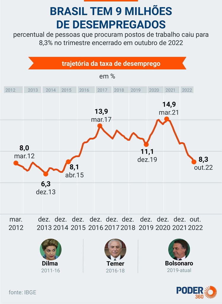A taxa de desemprego do Brasil caiu para 8,3% no trimestre de agosto, setembro e outubro. Esse é o menor percentual desde o trimestre encerrado em maio de 2015, quando registrou o mesmo percentual. O IBGE (Instituto Brasileiro de Geografia e Estatística) divulgou o resultado nesta 4ª feira (30.nov.2022).