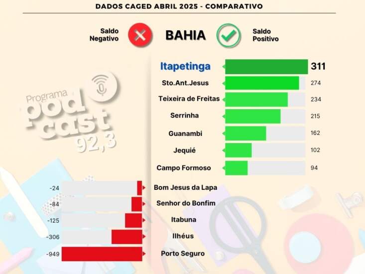 No quadro a seguir, você confere os números detalhados do CAGED e como Itapetinga se destaca frente a outras cidades importantes do estado: